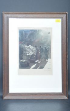 Reece Winstone (1909-1991) - An original signed Reece Winstone printed photograph of a street scene in St Nicholas Market, Bristol. The scene capturing three people purchasing fruit in the market. Entitled 'Market' and signed by Reece Winstone in pencil. Photography in Commerce and Industry hosted by the IBP in 1940. Dated 3:40pm 03/03/1938 to verso. Framed and Glazed. Measures 63cm x 49cm.