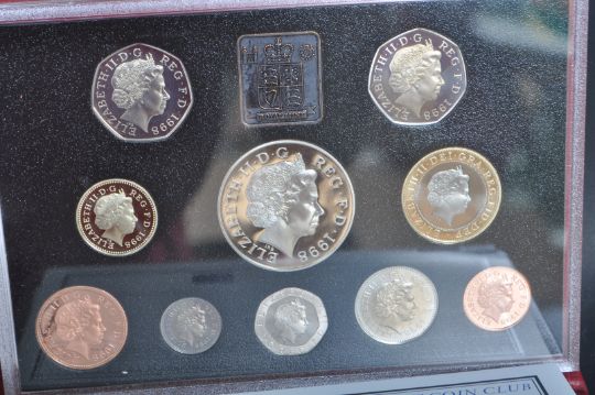 A Royal Mint 1998 Deluxe proof coin set comprising of Princes Trust £5 and more. Set within a red leatherette presentation case. Together with years 1995 & 1996 of Royal Mint Deluxe proof coin.