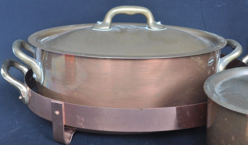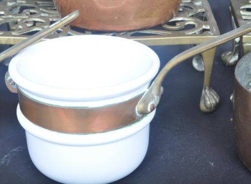 A collection of Victorian 19th century and later brass and copper items to include pierced brass trivets and copper kitchenalia such as sauce pans and kettles.