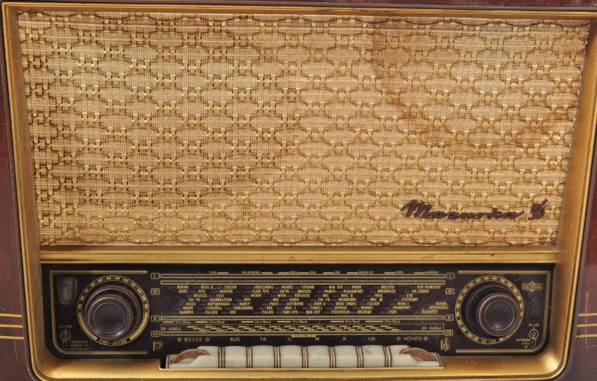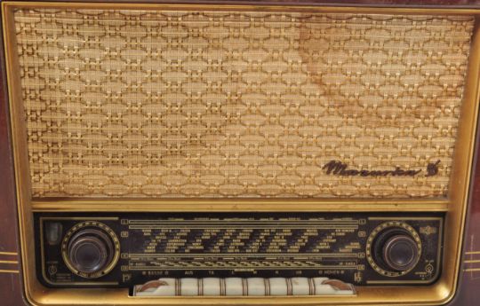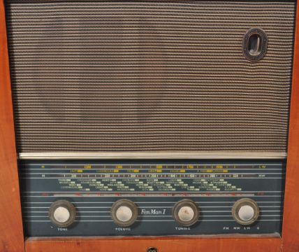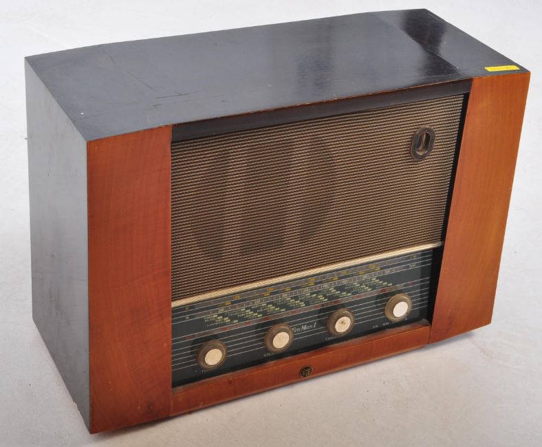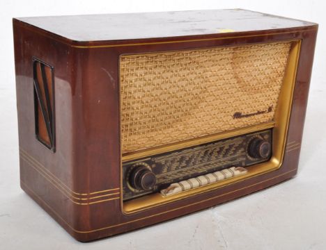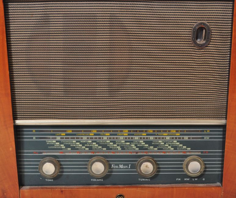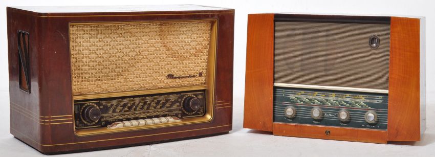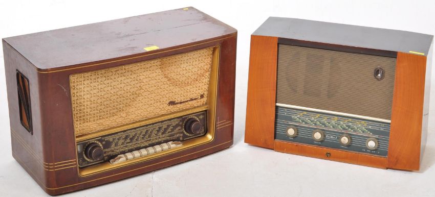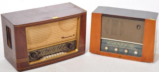 A pair of 2 retro vintage mid 20th Century wooden cased tube radio receivers. Models include Mazurka 56 & Pye ltd Fen Man I. Having both a material fronted speaker with knobs changing the frequency and the volume. Largest measures. (Untested)