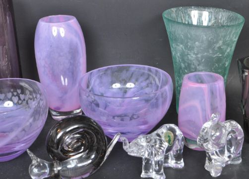 A large collection of vintage retro mid 20th century Murano and Caithness glass items to include an assortment of Caithness glass pieces to include a beakers, vases, bowls and an atomizer perfume bottle, all pieces marked to the base. Alongside a collection of Wedgwood glass paperweights, a red cased glass Murano stem vase, a blue tutti frutti pitcher vase and a clear glass block stem vase.