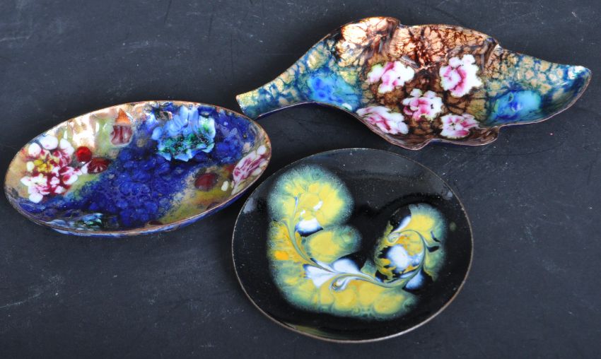 A collection of vintage 20th century Welsh Odyn hand enamelled pin dishes and trinket pots in a variety of shapes having polychrome enamel glass decoration atop copper. Measures 16cm in length.
