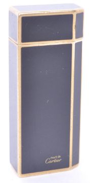 A vintage 1970s must de Cartier gold plated and black enamelled pocket lighter. The lighter of rectangular form with one canted edge and black panelled enamelling to the sides. Marked Must de Cartier to the base. Measures 6cm tall.