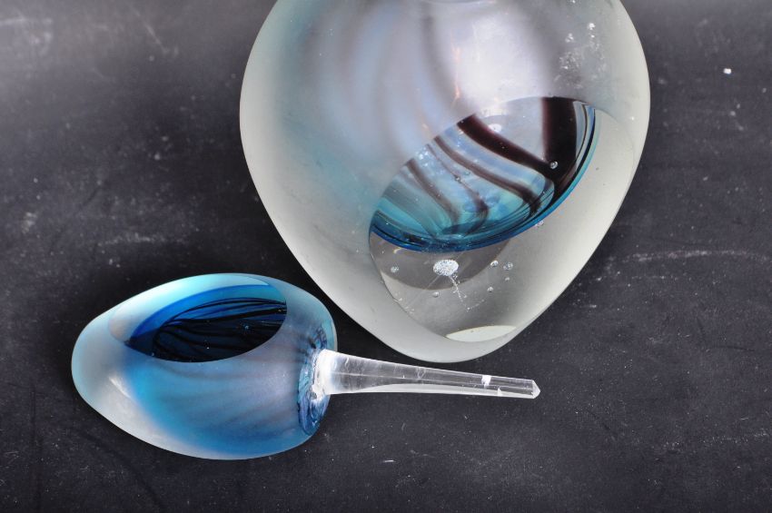 A retro vintage 20th century studio art glass Murano style perfume bottle of ovoid form. The perfume bottle having bubble control, a central swirl in blue and brown. Comes with stopper. Measures 22cm high.