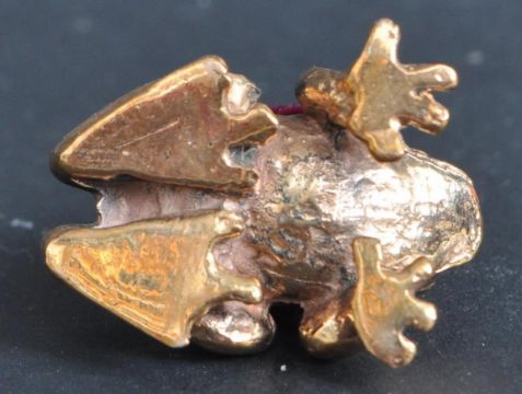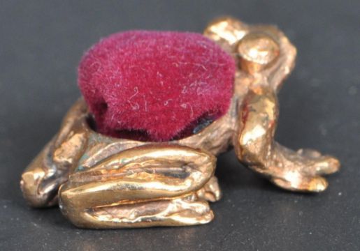 A vintage style 20th century brass pin cushion in the form of a frog with engraved features and red felt cushion to the back. Measures 3cm in length.