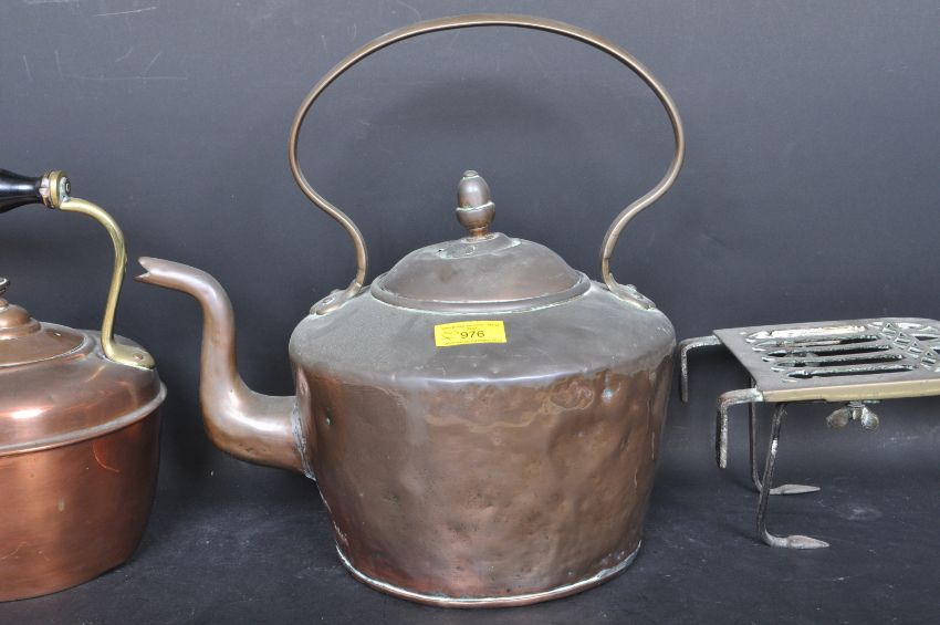 A pair of Victorian 19th century and early 20th century copper and metal teapots to include a copper teapot with a wooden handle with  fitted lid. Accompanied by a pierced metal trivet kettle stand with wooden handle. Measures 32cm tall.