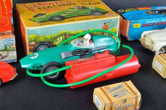 A collection of assorted vintage diecast, pressed tin plate and friction motor model cars to include; x3 Toy Ville Charbens miniature series diecast models, Empire made Vanwall electrically operated Grand Prix racing car, Empire made friction motor Mercedes-Benz and others.