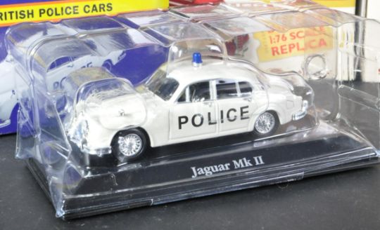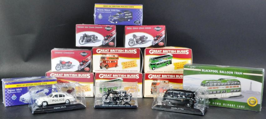 A collection of x14 assorted Atlas Editions diecast models from the Great British Buses, Classic Motorbikes, British Police Cars and Trams of the World range. Examples to include Jaguar MkIII Bedfordshire Police, Norton Commando motorbike, London Transport RTW Double Decker and others. Some duplicates, some factory sealed boxes.