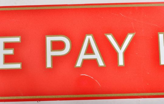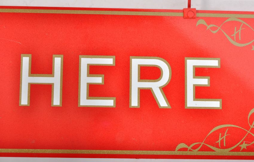 Hamleys - A large vintage 20th Century hand painted toy shop sign for Hamleys having a rich red ground colour with gilt borders and central white lettering reading 'Please Pay Here'. Decorative small H to each corner for Hamleys. Glitter finish throughout. Measures approx; 36cm x 213cm.