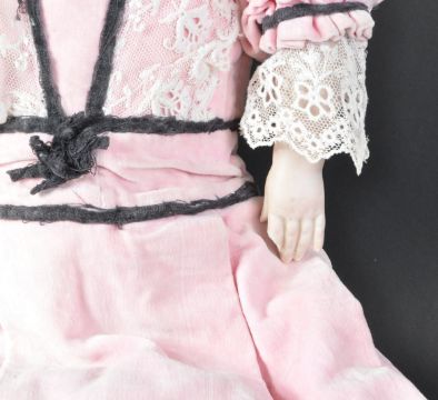 An early 20th Century believed French bisque headed doll. The doll having brown flirty eyes, finely painted brows and lashes, pierced ears and open mouth with all teeth present. Composition arms and upper torso with the remaining body of leather construction firmly stuffed. Measures approx 63cm.
