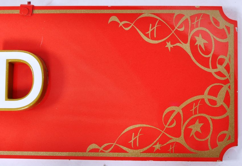 Hamleys - A large vintage 20th Century hand painted toy shop sign for Hamleys having a rich red ground colour with gilt borders and applied central lettering in gold and white. Lettering reads 'Cupboard' Decorative small H to each corner for Hamleys. Glitter finish throughout. Measures approx; 35cm x 245cm.