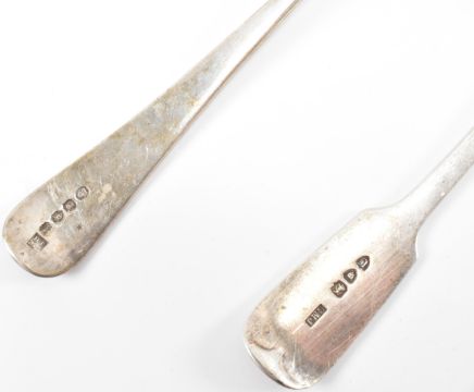 A group of three silver hallmarked 20th Century spoons. The antique lot to include a George III silver serving spoon by Thomas Wallis (II) & Jonathan Hayne, a Victorian fiddle pattern poon by Josiah Williams & co and a small spoon by Francis Stebbings. All hallmarked London, the first 1810, second 1895 and the third 1914. Weight 145g. Largest measures 21.5cm, smallest measures 16cm.