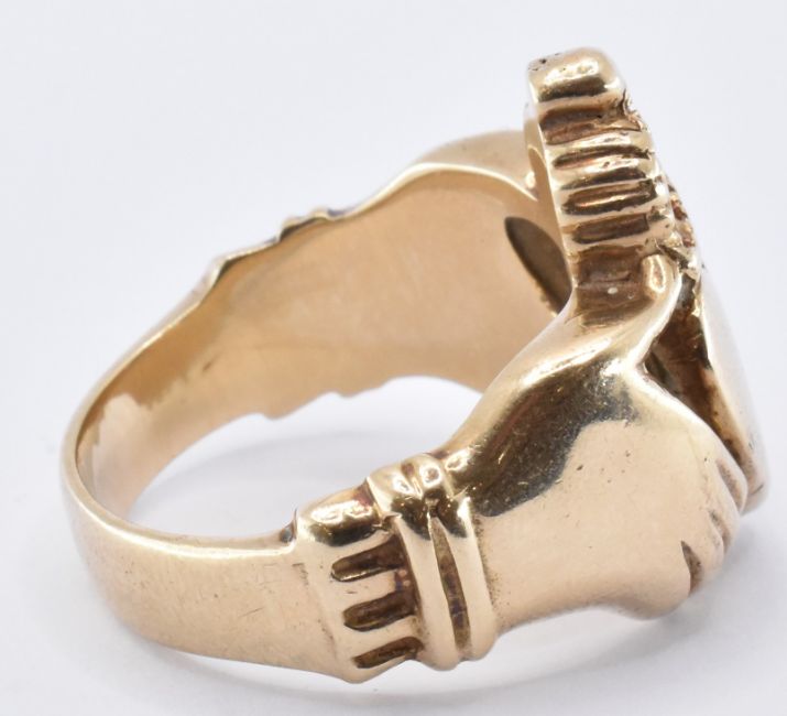 A hallmarked 9ct gold Claddagh ring having a heart clasped in hands to the head. Hallmarked Sheffield 1999. Weight 25.4g. Size Z.