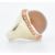 A Danish 18ct gold moonstone and coral cocktail ring. The ring set with a round moonstone high cabochon framed by graduating round graduating coral cabochons. The mount having a unique star constellation cut out design verso to tapering plan shank. Head measures approx 2.5cms. Moonstone 18.7mm x 11.5mm approx 30ct.  Coral  2mm - 3.5mm. Stamped 750 with makers mark. Weight 22.4g.  Size N.