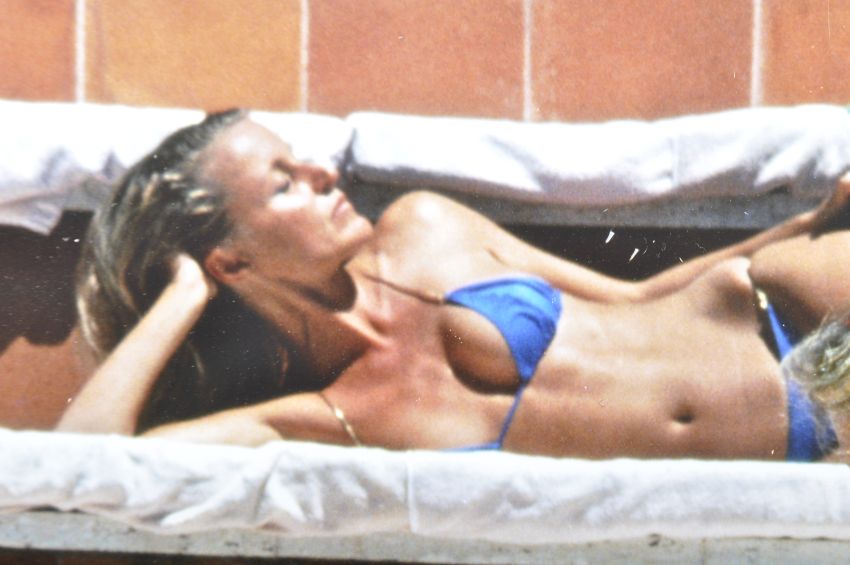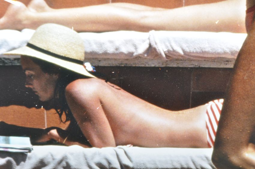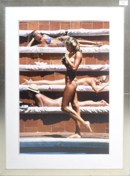After Slim Aarons (American 1916-2006) - Catherine Wilke - A late 20th Century photo print depicting topless sunbathers on the island of Capri. Set within a silvered frame. Measures approx; 78cm x 58cm.