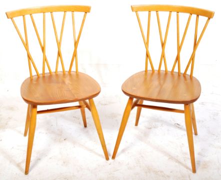 Lucian Ercolani - Ercol - Model 376 - A matching pair of retro vintage 1960's blonde beech and elm ' Candlestick ' lattice backed spindle dining / desk side chairs with saddle seat and 'X' frame stretcher. Each raised on splayed supports united by a single stretcher. Each measures approx; 82cm x 42cm x 43cm.