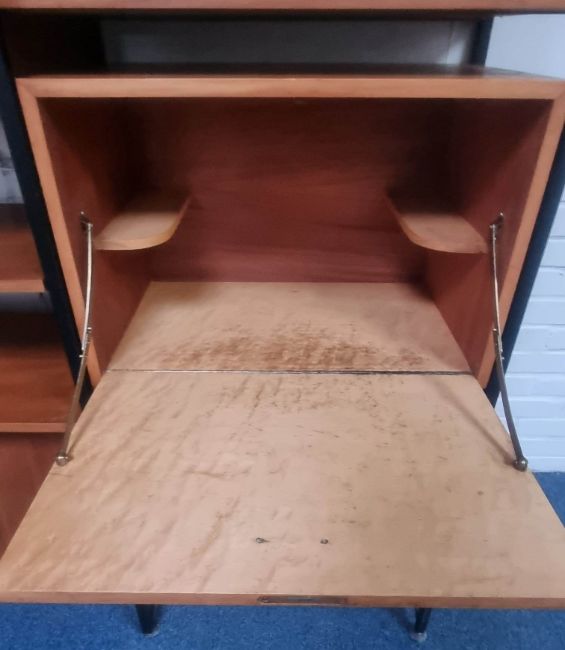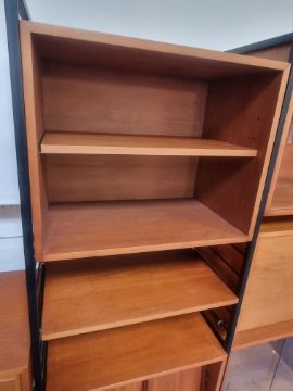 Robert Heal - Staples - Ladderax - An original retro vintage 20th Century graduating three bay modular wall unit comprising of black metal painted upright supports with a series of adjustable cupboards / cabinets, drawer section and shelves. Some bar supports no present. Measures approx;