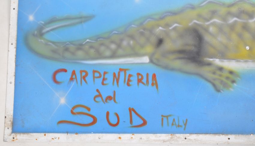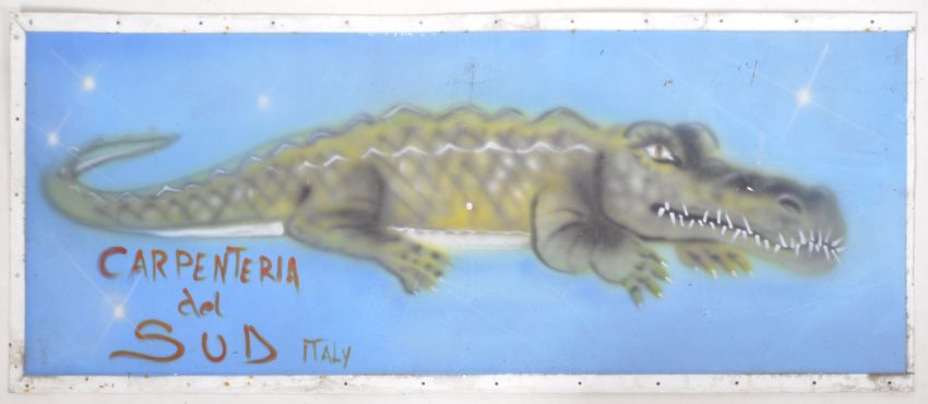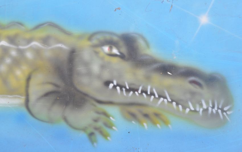 A collection of three retro vintage 20th Century painted aluminium fairground funfair carnival signage comprising an example with stencilled lettering reading Magic, another with Circus and a final example depicting a crocodile. Measures approx; 150cm.