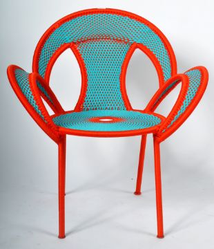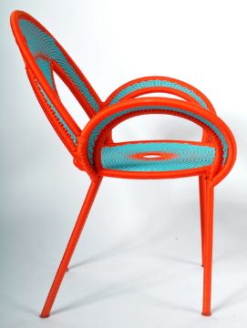 M'Afrique - Banjooli Armchair - Moroso - A contemporary designer armchair of plastic cord wrap to a metal frame. Vibrant colours of blue and orange woven throughout creating a stylish finish. Wide sweeping armrests with all raised on cylindrical supports. Good condition all round. Measures approx; 90cm x 80cm x 60cm.