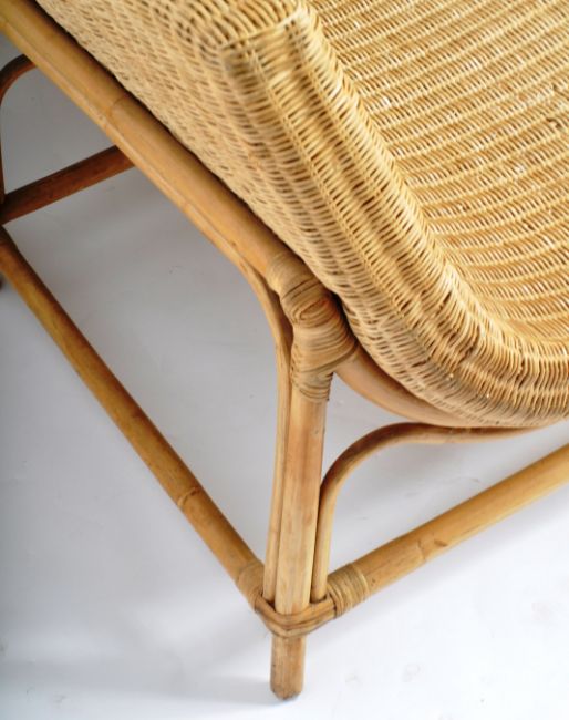 A retro 20th Century wicker / cane and bamboo bench / sofa settee of stylish curved form having a one piece woven curved seat and backrest. Raised on six supports united by stretchers around. Measures approx; 74cm x 151cm x 86cm.
