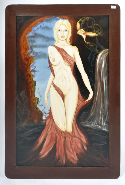 Colin Fraser (Scottish b. 1956) Attributed to - An oil on board erotic painting depicting a nude blonde lady draped in red silk stood in an underwater setting. Signed to the bottom right C. Fraser. Set within a wooden frame. Painting measures approx; 1170mm x 750mm. Frame measures approx; 136cm x 92cm.