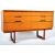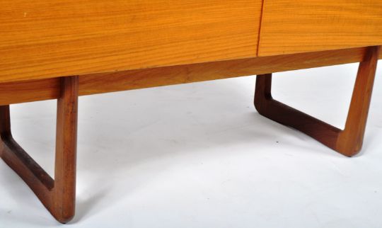 Uniflex - A retro mid 20th Century teak dressing table chest having a drawer configuration two banks of three with all having recessed hidden handles. All raised upon sleigh supports. Makers stamp to the inner drawer. Measures approx; 71cm x 121cm x 46cm.