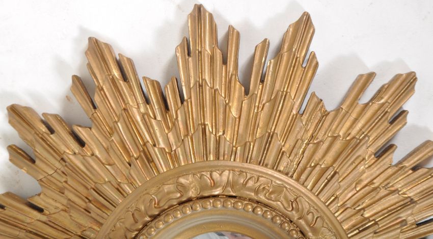 A 1950’s Art Deco style gilt sunburst wall mirror having a convex circular mirror glass panel to the centre stranded by pointed sunburst decoration. Measures approx; 45cm wide.