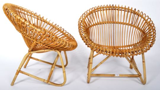 A matching pair retro vintage 1960's Italian cane satellite easy lounge chair in the manner of Franco Albini. The tub shape chair comprising of two interlocking circles with cane rail seats and backs all raised on shaped leg supports united by a stretcher. Each chair measures approx; 81cm x 78cm x 66cm.