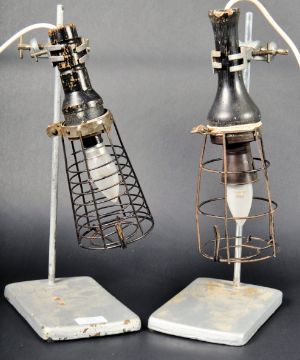A pair of retro vintage mid 20th Century industrial inspection lamp lights with each having ebonised wood handles with black painted cages. Each raised and supported on scientific lab / laboratory stands by Gallenkamp. Each measures approx; 42cm x 20cm x 13cm.