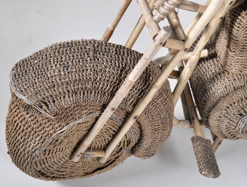 A large life size retro 20th Century 1960's bamboo, rattan and wicker Harley Davidson motorcycle bike model display. The bike with realistically details including saddlebags, exhaust, lamps, handlebars etc. Measures approx; 112cm x 165cm x 63cm.