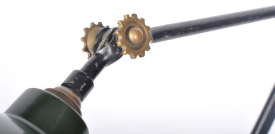 John Dugdill & Co - A large vintage 20th Century 1930's Art Deco industrial engineers articulated multi positional mountable desk lamp light. The lamp having a green enamel shade with white finished interior with all raised on three ebonised metal arms with brass COG joints with all raised on a circular brass mount base. Raised and impressed makers marks to the base 'Dugdill AP9102'. Measures approx fully extended; 160cm long.