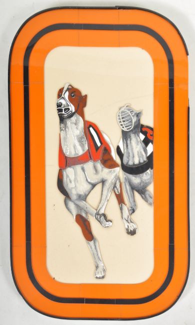 A retro 20th Century betting shop / bookies dog racing display art sign of acrylic construction. Rounded elongated form with orange and black border and central dogs racing. Wear commensurate with age. Measures approx; 80cm x 46cm.