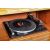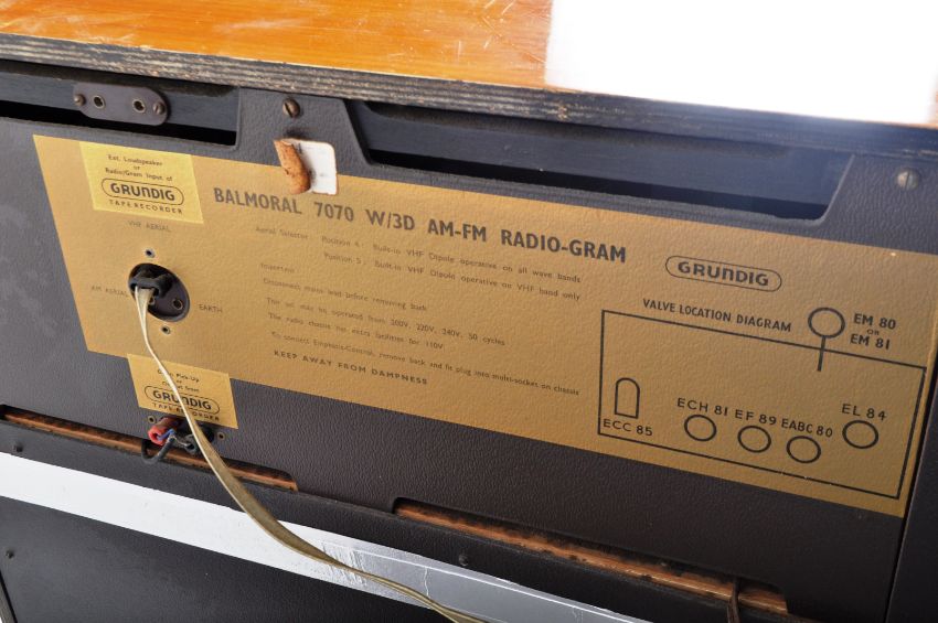 Grundig - A retro vintage mid 20th Century walnut veneered radiogram / music system having 3D Sound and a Garrard record deck turntable model SP25 MKIII. All housed with a walnut veneered music cabinet with sliding doors to the front with Deco inspired handles and all raised on splayed tapering supports. Measures approx; 96cm x 121cm x 37cm.
