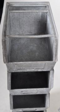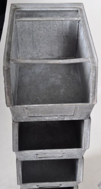 A stack of ten vintage 20th Century galvanised metal stacking space saver storage trays / boxes with each having notation slides flanked by embossed lettering reading "Space Saver". Each individually measures approx; 21cm x 22cm x 34cm.