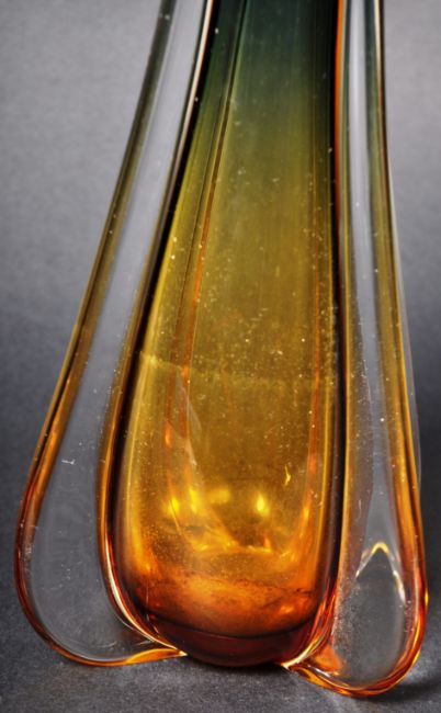 A good quality retro vintage mid 20th Century studio art glass vase. The sommerso / cased glass vase in deep blue and amber with elongated pulled neck terminating in a large bulbous base with exposed sections. Unsigned. Measures approx; 27cm tall. In good condition.