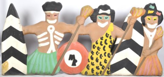 A large retro vintage 20th Century fairground / funfair stone age / cavemen fiberglass hand painted panel (possibly from a fun house). The panel featuring three men wearing animal skin garments holding weapons with the reverse painted in red. Metal hanging mounts to the verso. Measures approx; 114cm x 250cm.