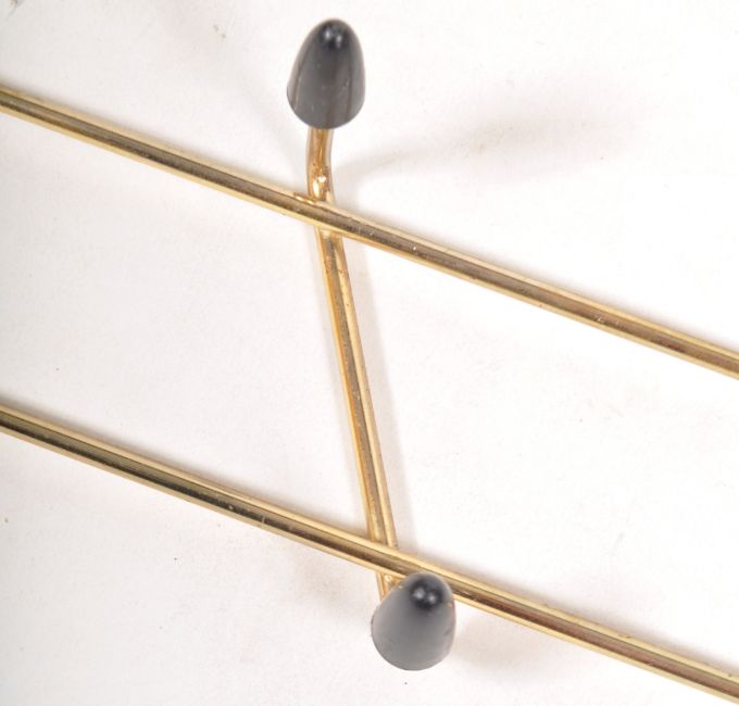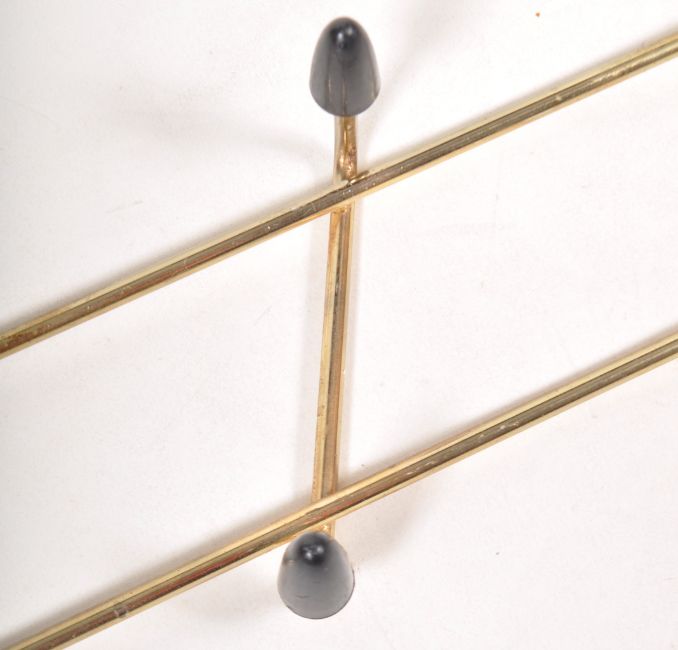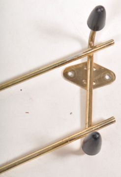 A set of retro vintage mid 20th Century sputnik atomic coat hooks of twin bar shape form with painted coloured ball finials and brass effect finished wire support. Wear commensurate with age. Measures approx; 70cm wide.
