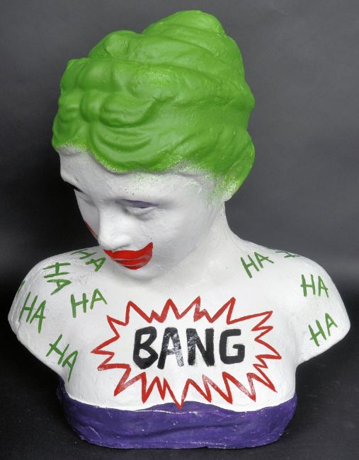 A contemporary painted terracotta bust of a classical lady graffitied in the Joker style with green painted hair, big red lips with 'Ha Ha' throughout and central "bang". Taken from the Suicide Squad film. Measures approx; 31cm x 25cm.