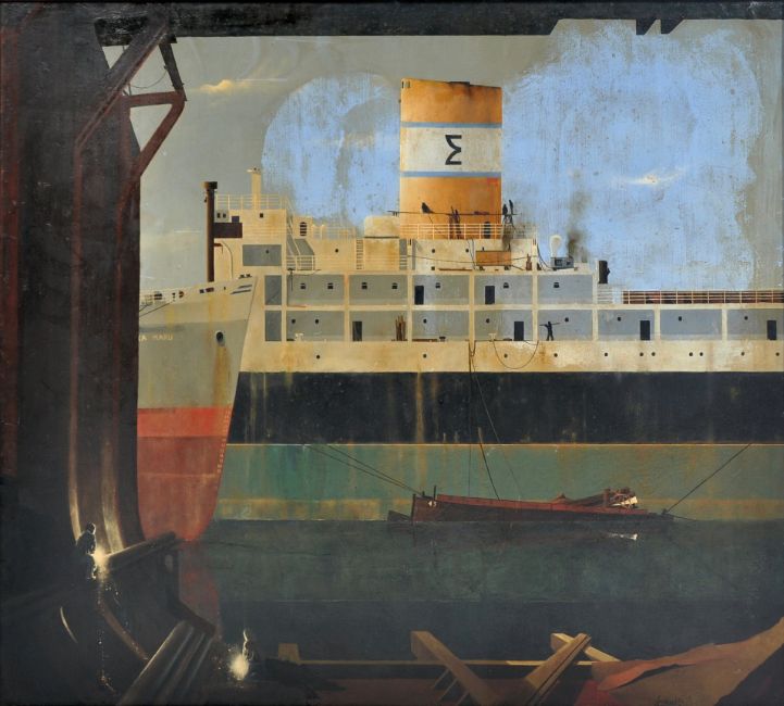 A mid 20th Century oil on board painting depicting a Greek industrial shipping yard with a large ships docked having a stripped funnel with the Greek letter for Sigma. Signed to the lower right G. Wood '81. Set within a pine frame. Painting measures approx; 740mm x 850mm. Frame measures approx; 77cm x 89cm.
