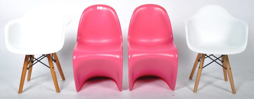 After Panton / Eames DWA - A matching pair of contemporary Vitra style children's chairs finished in pink together with a pair of DWA style chairs finished in white raised on beech splayed legs. DWA chairs measures approx ;