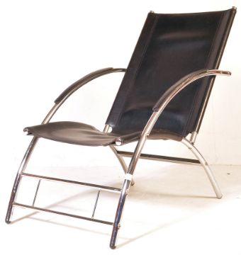 A retro 20th Century 1970's leather and chrome easy lounge chair / armchair of sling form having a one piece black leather seat and backrest. Bowed armrests with further leather padding terminating to the tubular supports united by a H-stretcher. Measures approx; 92cm x 54cm x 88cm.