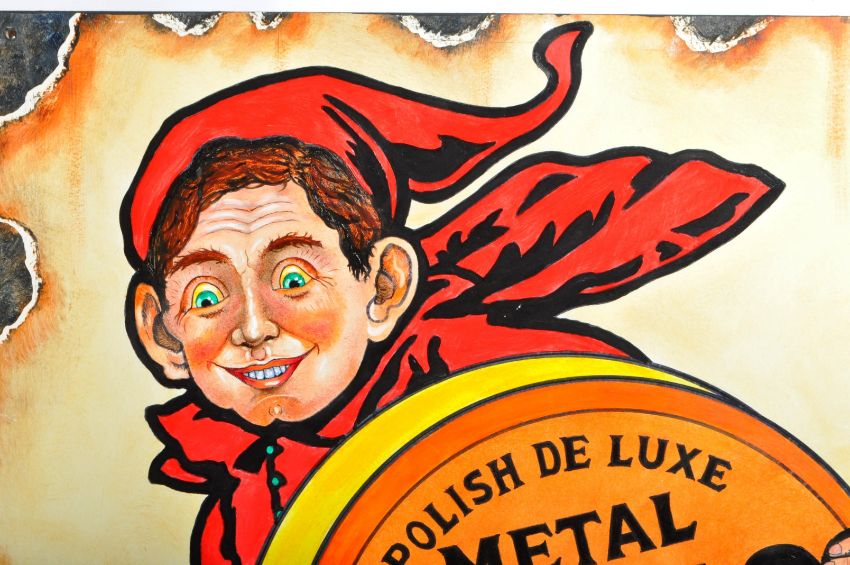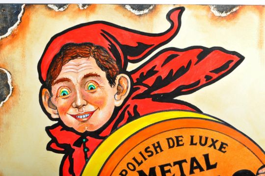 Komo - A contemporary oil on board artist's impression painting of a traditional advertising enamel sign. The sign featuring an elf carrying a tin of Komo Metal Paste. Measures approx; 72cm x 57cm.