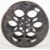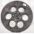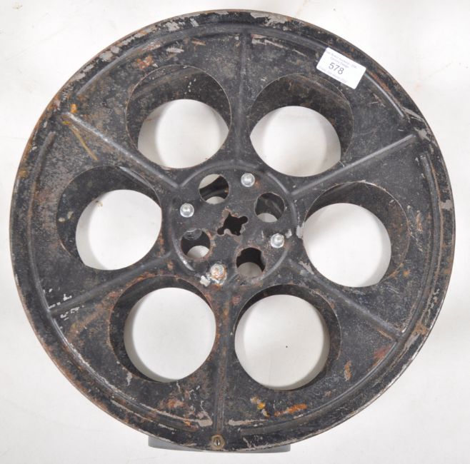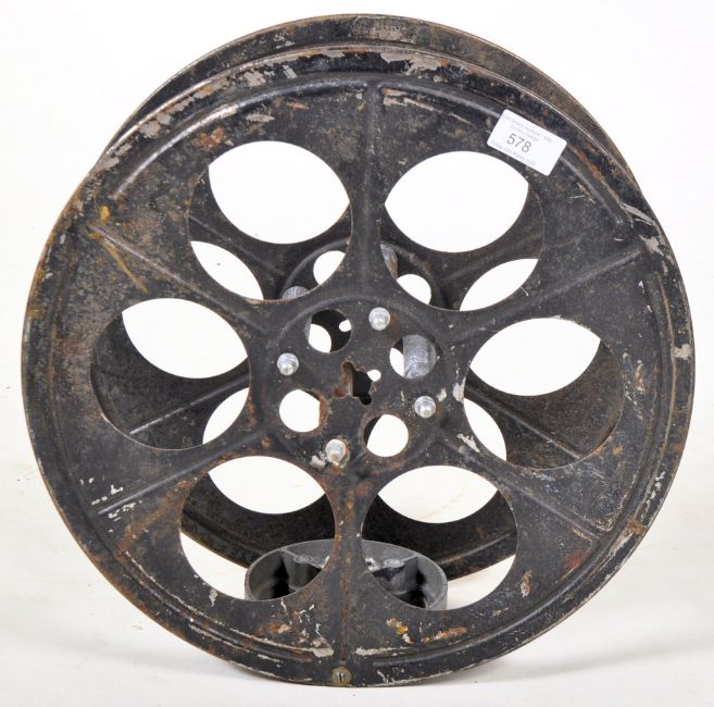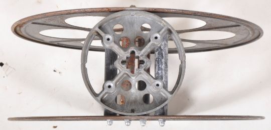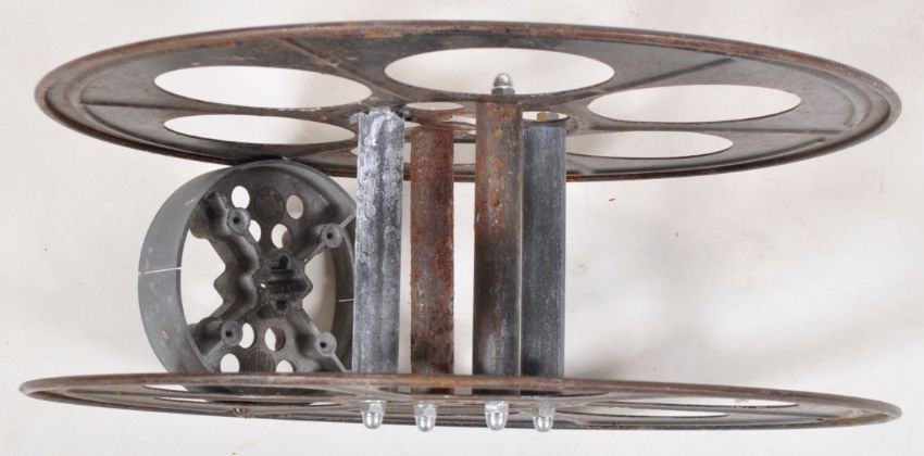A retro vintage mid 20th Century metal film reel wine bottle rack. The reel of typical circular form with six open sections raised on inset circular base. Stamped Premier. Measures approx; 38cm tall.