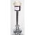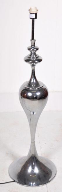 A large contemporary polished metal floor standing lamp light having a turned stem over a bulbous body with waisted centre and all raised on a wide circular foot. Sold as untested by ourselves. Elongated grey cylindrical shade atop. Measures approx; 120cm tall.