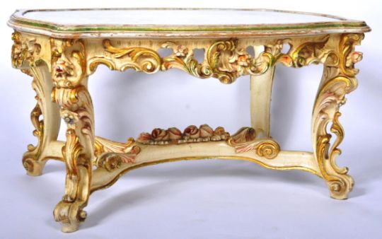 A set of three late 20th Century Rococo influenced Hollywood Regency baroque inspired glass topped side table / occasional table comprising a large coffee table. All decorated with carved flowers and gesso type paint, Measures approx; 47cm x 92cm x 65cm.