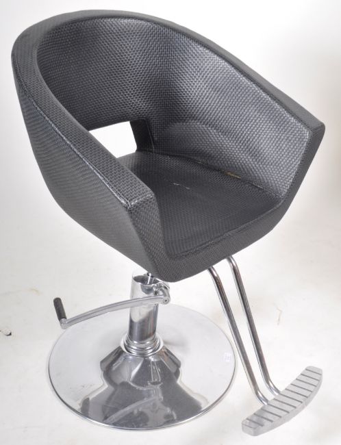 A contemporary swivel barber's / salon armchair / tub chair having faux black leather upholstery to the back and seat rest with all raised on a single adjustable stem upon a chrome circular base. Footrest to the front with lever to the back. Wear commensurate with age mostly to the seat and faux leather. Measures approx; 86cm x 68cm x 72cm.