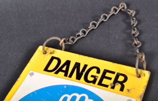 A retro vintage mid 20th Century Doctors medical surgical surgery enamel sign. The sign of rectangular form with yellow ground and bold black lettering reading Danger Sharp Doctor Blades. Fixed wear gloves sign attached. Measures approx; 31cm x 17cm.