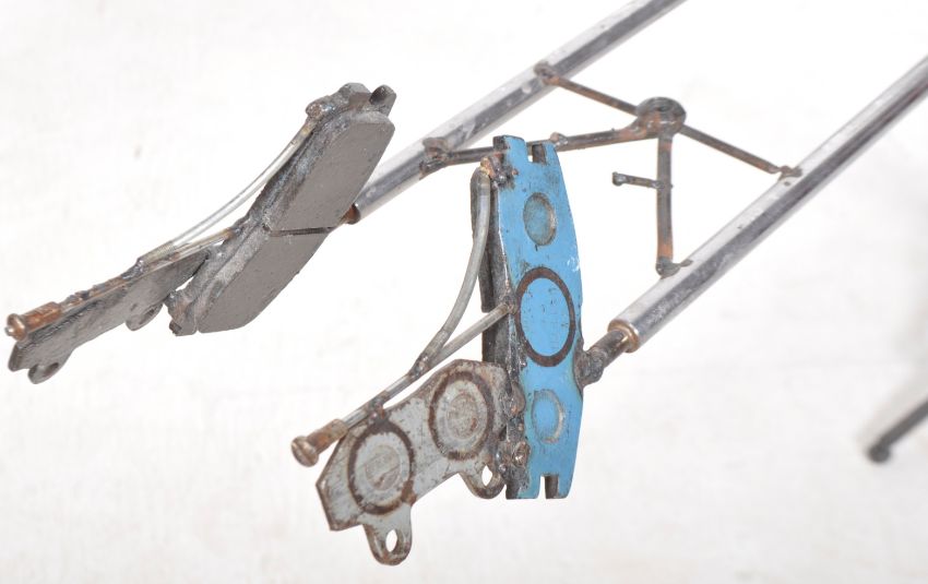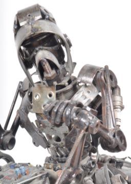 A contemporary steampunk scratch built Star Wars stormtrooper / scout trooper riding a speeder bike. Constructed from various car / bike parts and other industrial metal works. Raised and supported upon a metal steam upon a scrolled tripod and cog base. Measures approx; 50cm x 75cm x 28cm.