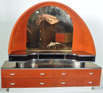 Verardo - A 20th Century Italian retro vintage faux suede and mirrored glass dressing table desk featuring a large shaped mirror back raised on floating mirrored glass top raised over a two bank chest sideboard  base. All raised on a mirrored suspension effect plinth base.  Measures 152cm x 170cm x 48cm.