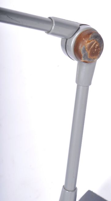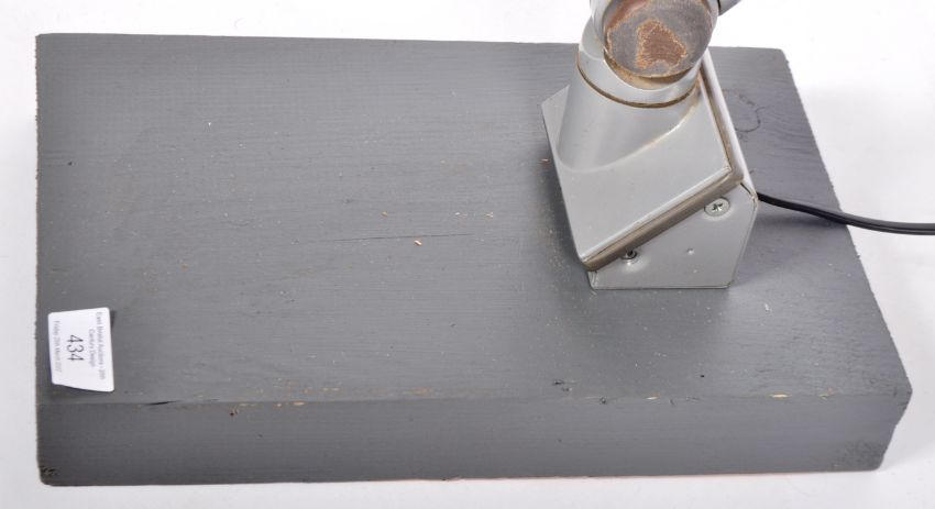 EDL - A retro vintage 20th Century industrial factory work desk table lamp light having an enamel shade on an adjustable three part anglepoise arm. All raised on wooden plinth base finished on grey. Measures approx; 69cm in photo.